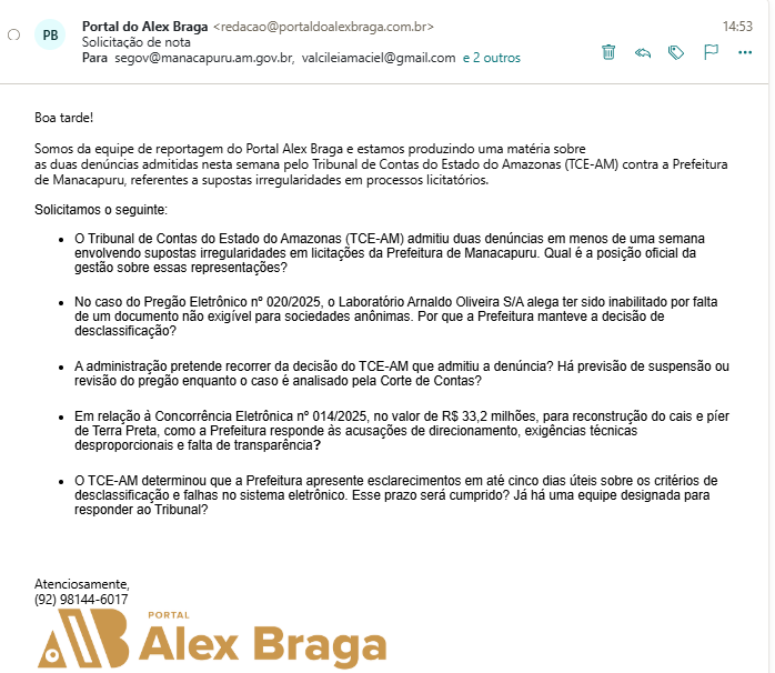 Essa é a segunda denúncia admitida pelo TCE-AM seguida contra a gestão Valciléia Maciel. A primeira envolve a Concorrência Eletrônica nº 014/2025, no valor de R$ 33,2 milhões, destinada à reconstrução do cais e píer da comunidade de Terra Preta — uma das obras mais caras da atual administração.