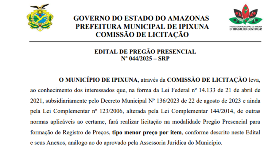 O argumento, no entanto, levanta Ainda conforme a justificativa oficial, as empresas locais “se enquadram melhor para o fornecimento, levando em conta a localização de Ipixuna” e o suposto “desconhecimento ou dificuldades técnicas” de empresários da região para operar em ambiente eletrônico. O argumento, no entanto, levanta questionamentos sobre o real motivo da opção pelo formato presencial, menos acessível para fiscalização externa e com menor alcance competitivo.