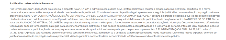 De acordo com a Comissão Permanente de Licitação, a escolha do pregão presencial, em vez do formato eletrônico mais comum e transparente, teria sido motivada por “limitação de acesso ou infraestrutura tecnológica insuficiente dos potenciais fornecedores locais”. Segundo o documento, a modalidade presencial garantiria maior participação de empresas do próprio município.