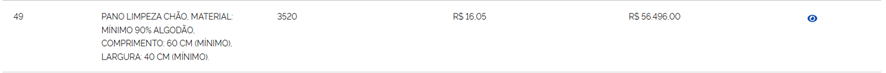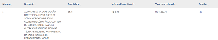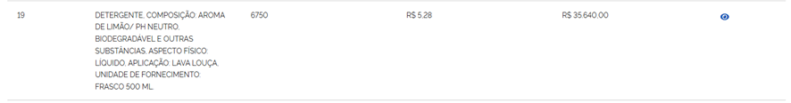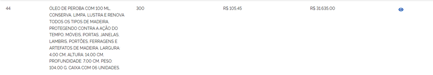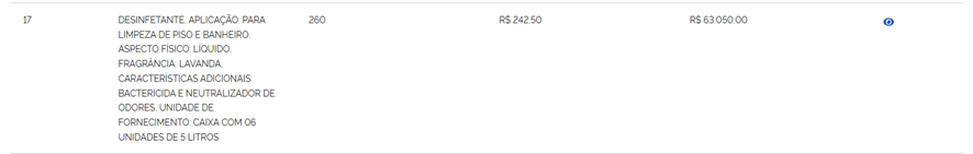A licitação também chama atenção pelos valores e quantidades dos produtos listados. Serão adquiridas, por exemplo, 6.575 caixas de água sanitária, ao custo total de R$ 41.619, além de 300 caixas de óleo de peroba, avaliadas em R$ 31.635. Outros itens também impressionam: 3.520 panos de chão por R$ 61.124, 6.750 frascos de detergente de limão por R$ 35.640, e 260 caixas de desinfetante, que somam R$ 63.050.00.