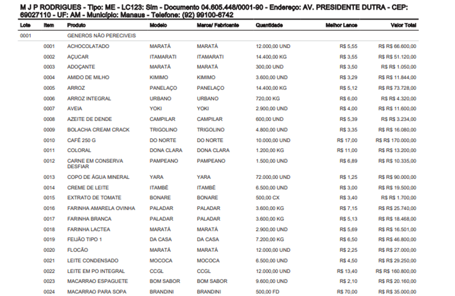 O volume chamou atenção. Segundo o documento da licitação, estavam previstos mais de 12 mil pacotes de achocolatado, ao custo médio de R$ 117 mil, além de 14.400 quilos de arroz, orçados em R$ 145 mil. O fornecimento dos itens ficou sob responsabilidade da empresa M. J. P. Rodrigues LTDA, do empresário Mário Jorge Paixão Rodrigues.
