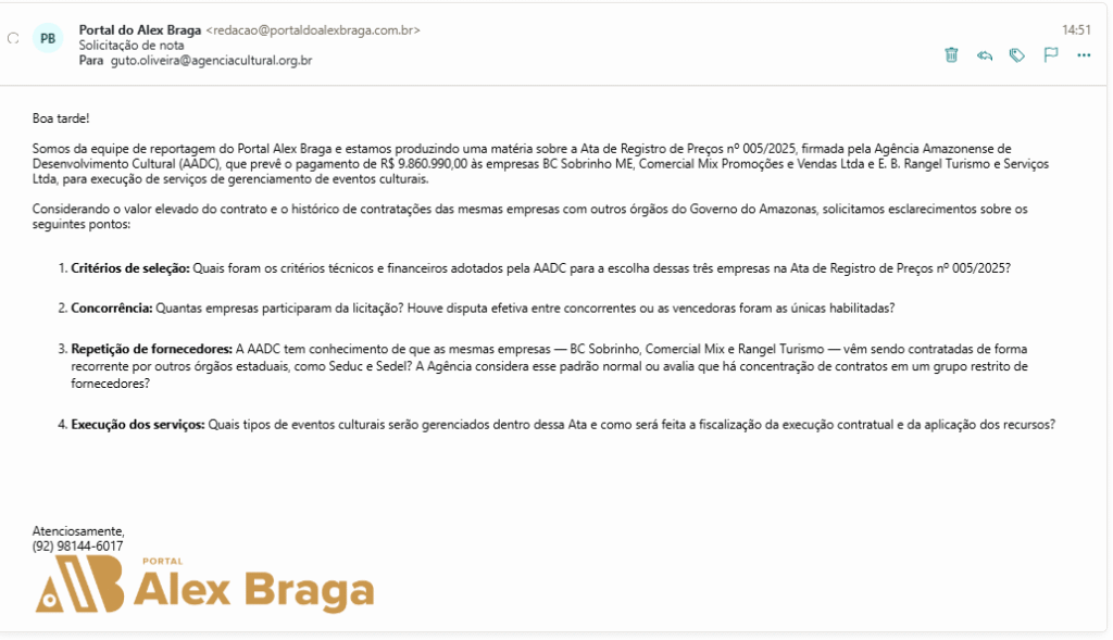Em mais um episódio que evidencia a concentração de recursos públicos nas mãos de um mesmo grupo empresarial, a gestão do governador Wilson Lima (União Brasil) destinará R$ 9.860.990,00 a três de suas empresas favoritas: BC Sobrinho ME, Comercial Mix Promoções e Vendas Ltda e E. B. Rangel Turismo e Serviços Ltda. O novo contrato milionário foi firmado por meio da Ata de Registro de Preços nº 005/2025, assinada pela Agência Amazonense de Desenvolvimento Cultural (AADC) em 19 de março de 2025, com validade de 12 meses.