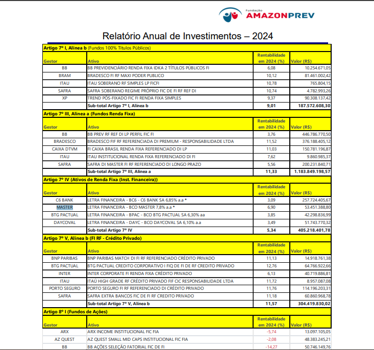 A Fundação Amazonprev aplicou R$ 50 milhões em Letras Financeiras do Banco Master em 6 de junho de 2024, aproximadamente um ano antes de a instituição financeira ser levada à liquidação extrajudicial pelo Banco Central.