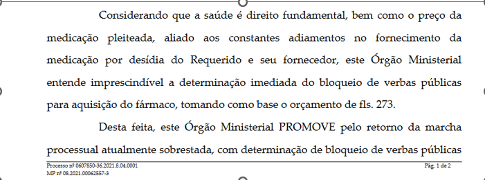 Em maio deste ano, a promotora de Justiça da 3ª Vara da Fazenda Pública, Marlinda Maria Dutra de Oliveira, chegou a pedir o bloqueio de verbas públicas para garantir a compra imediata do medicamento.