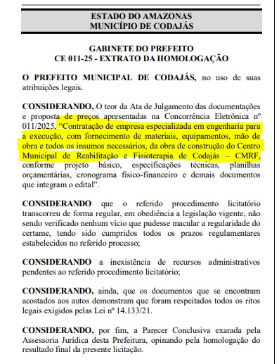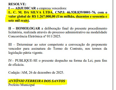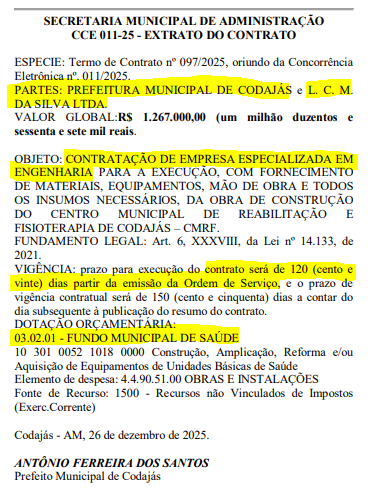 O documento publicado no Diário Oficial dos Municípios (DOM), foi oriundo do Termo de Contrato n° 097/2025 em que a prefeitura de Codajás beneficia diretamente a empresa L. C. M. da Silva Ltda,. com o valor global de R$ 1.267.000,00 (Um milhão duzentos e sessenta e sete mil reais).