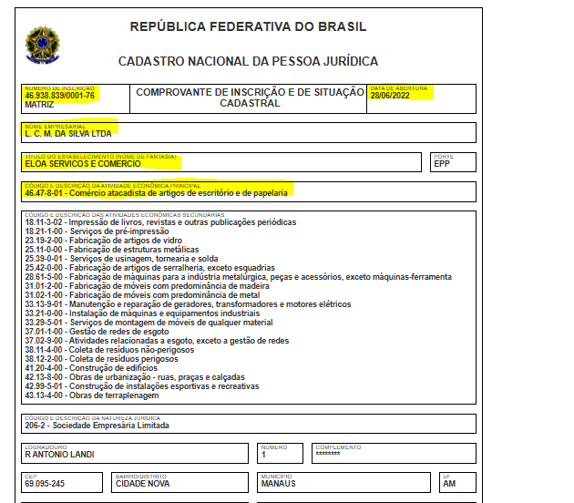 A empresa com a razão social L. C. M. da Silva Ltda, tem o nome fantasia Eloa Servicos e Comercio, opera com o CNPJ 46.938.839/0001-76 e foi fundada em 2022. O endereço de sua sede está localizada na Rua Antônio Landi, 1 – Cidade Nova, Manaus. Sua atividade principal é de Comércio atacadista de artigos de escritório e de papelaria.