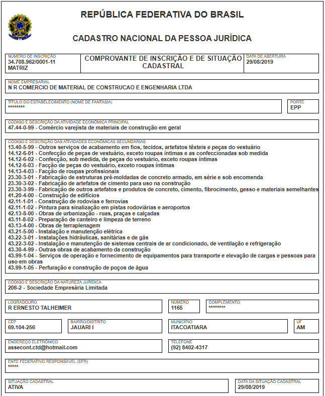 O contrato milionário assinado pelo prefeito foi firmado com a empresa registrada como NR Comércio de Material de Construção e Engenharia Ltda, inscrita no CNPJ nº 34.708.962/0001-11. A qual apresenta como atividade principal, o comércio varejista de materiais de construção e ainda outras diversas atividades secundárias, como confecção de vestuário, varejo de materiais de papelaria etc.