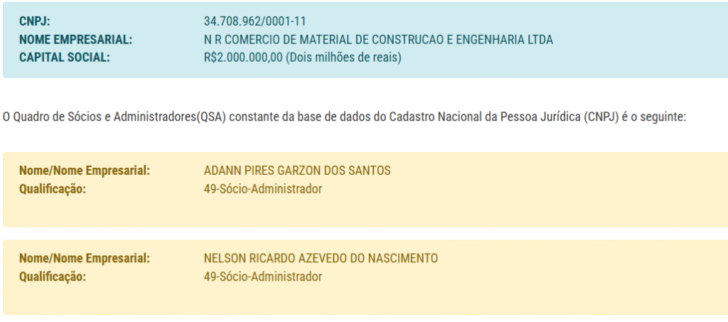 No quadro de sócio e administradores (QSA), aparecem dois empresários como administradores da empresa, identificados como Adann Pires Garzon dos Santos e Nelson Ricardo Azevedo do Nascimento. Com um capital social de R$ 2 milhões.