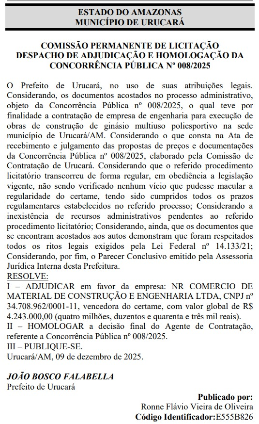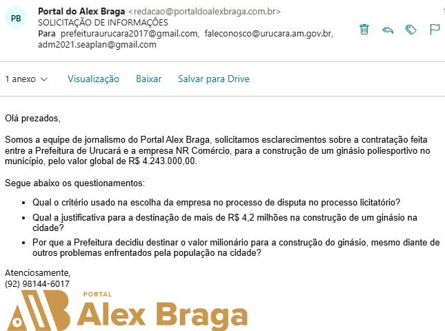A equipe de jornalismo do Portal do Alex Braga tentou contato com a Prefeitura de Urucará e com o prefeito Bosco Falabella e ainda com a empresa contratada, para pedir mais esclarecimentos sobre a construção do ginásio na cidade e detalhes sobre o processo licitatório da escolha da empresa para realizar a obra. Contudo, até o fechamento desta matéria não obtivemos retorno. O espaço segue aberto para mais esclarecimentos.