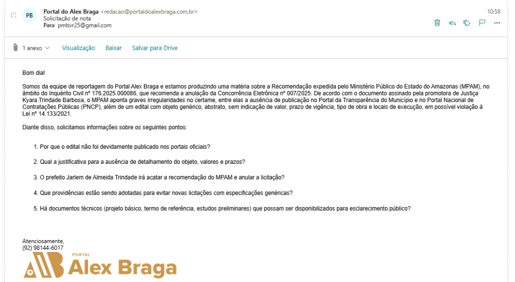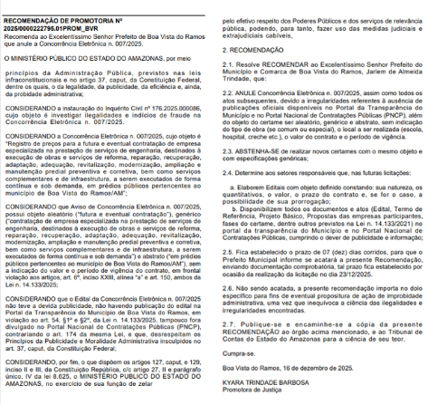 A gestão do prefeito Jarlem CB (PSB), em Boa Vista do Ramos, voltou a ser alvo de questionamentos após o Ministério Público do Estado do Amazonas (MPAM) recomendar a anulação imediata da Concorrência Eletrônica nº 007/2025, destinada à contratação de serviços de engenharia. O órgão aponta graves irregularidades, que vão desde a falta de transparência até a ausência de informações básicas no edital, como valor do contrato, tipo de obra e locais de execução.