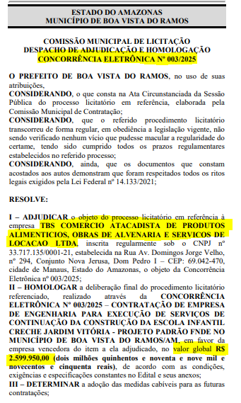 LEIA MAIS: Jarlem CB paga empresas alimentícias para obras de R$ 2,6 milhões em Boa Vista do Ramos