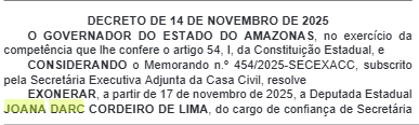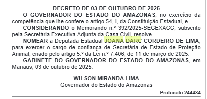 Dois dias depois, na quarta-feira (19), a nomeação da deputa saiu no Diário Oficial do Estado (DOE), e Wilson Lima a reconduziu ao cargo de confiança na Sepet.