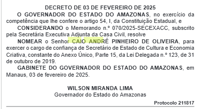O governador Wilson Lima (União Brasil), parece ter um grande apego e gratidão por exclusivamente, dois secretários: Caio André (ex-vereador de Manaus) e Joana Darc (deputada estadual licenciada). Durante uma longa dança das cadeiras, André e Darc já foram exonerados e nomeados, algumas vezes, para o comando das secretarias de: Cultura e Economia Criativa e Proteção Animal. O retorno de ambos, reforça a tese de que o chefe de Estado e seus aliados realizam manobras políticas nessas secretarias.