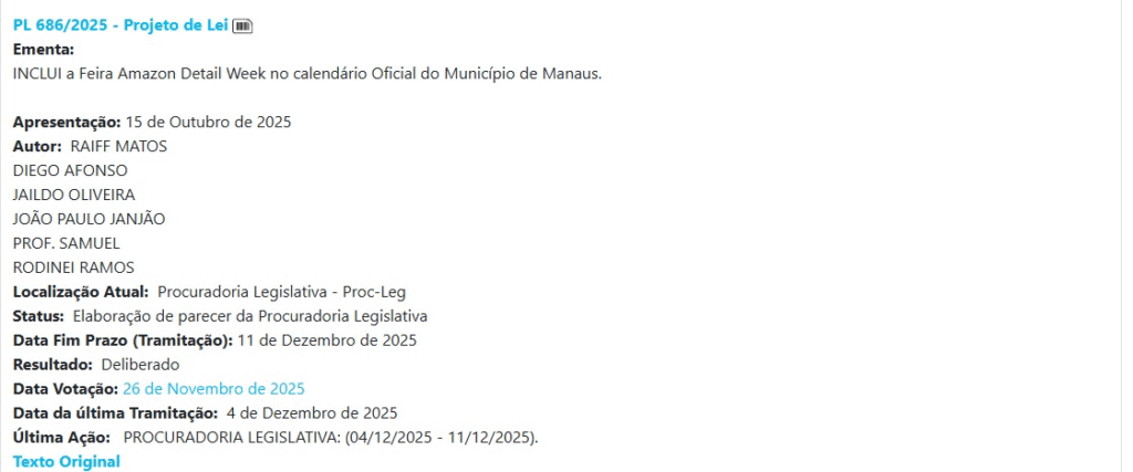 Ainda seguindo e compartilhando seu amor por carros, Raiff Matos apresentou o PL n° 686/2025 que inclui a Feira Amazon Detail Week no calendário oficial do município.