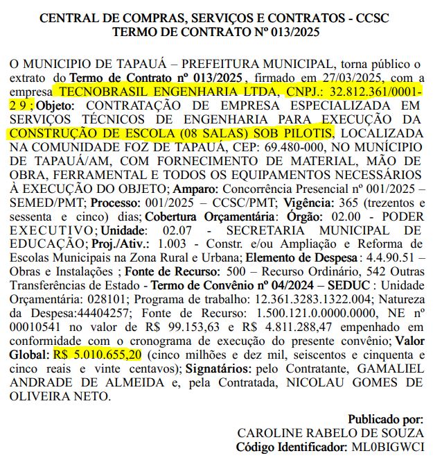 Nos acordos feitos, registram o nome da empresa TecnoBrasil Engenharia Ltda, inscrita no CNPJ nº 32.812.361/0001-29.