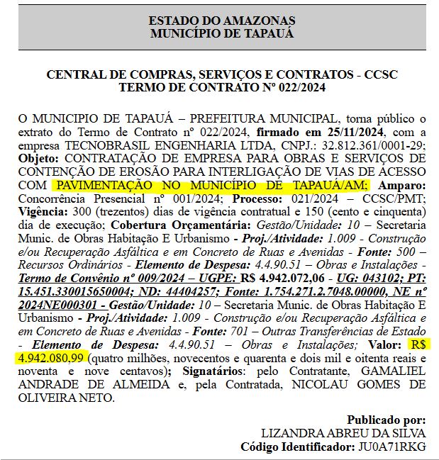 Assim, como outro contrato, também para pavimentação custando mais de R$ 4,94 milhões, assinado em 2024.