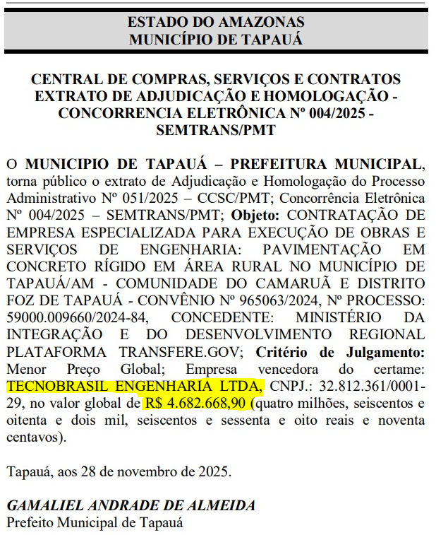O prefeito de Tapauá, Gamaliel Andrade (União Brasil), pretende destinar mais de R$ 4,68 milhões na pavimentação da comunidade do Camaruã e o Distrito do Foz de Tapauá. A empresa contrata já recebeu um contrato de mais R$ 5 milhões, em março deste ano, para construir escola em uma das comunidades, que agora, vão receber pavimentação.