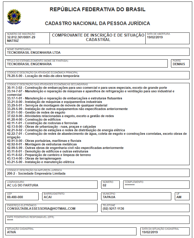 Segundo as informações da empresa no site da Receita Federal, a mesma afirma ter como atividade principal a “locação de mão-de-obra temporária”, assim como outras atividades relacionadas a construção e manutenção de embarcações, instalações, construção de edifícios, transporte por navegação e entre outras.
