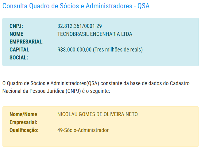 O empresário à frente da empresa é identificado como Nicolau Gomes de Oliveira Neto. Sendo o único registrado como administrador da empresa que tem um capital social de R$ 3 milhões, localizada no próprio município.