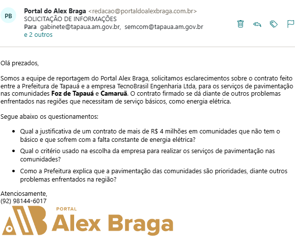 A equipe de reportagem do Portal Alex Braga tentou contato com a Prefeitura de Tapauá e o prefeito Gamaliel Andrade, assim como também com a empresa contrata. Para pedir mais esclarecimentos sobre a necessidade da obra e uma justificativa sobre o valor destinado. Mas até o fechamento desta matéria não obtivemos retorno. O espaço segue aberto para mais esclarecimentos.