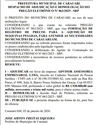 De acordo com a publicação do Diário Oficial dos Municípios (DOM), Airton Siqueira homologou o Pregão Eletrônico n° 063/2025 em favor da empresa Advisor Assessoria Empresarial Ltda., pelo valor global de R$ 1.930.000,00 (Um milhão e novecentos e trinta mil reais), para o que resumiu em “aquisição de máquinas pesadas”.