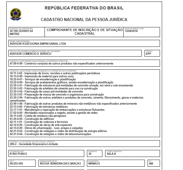 A empresa com a razão social Advisor Assessoria Empresarial Ltda, tem o nome fantasia Advisor Comercio e Serviço, opera com o CNPJ 30.190.353/0001-62 e foi fundada em 2018. O endereço de sua sede está localizada na Rua Rio Purus, 30 – Nossa Senhora das Graças, Manaus – AM, 69.053-050. Sua atividade principal é de Comércio varejista de outros produtos não especificados anteriormente.