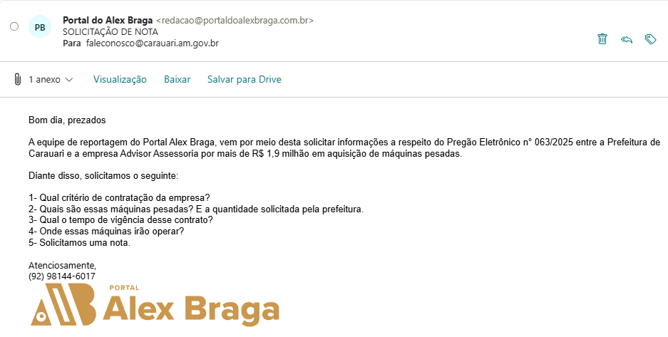 O Núcleo Investigativo do (PAB), encaminhou um pedido de nota a Prefeitura de Carauari solicitando informações a respeito desse contrato. Até o fechamento da reportagem, nenhum retorno nos foi dado. O espaço continua aberto.