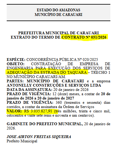 O prefeito de Carauari, Airton Siqueira (MDB), firmou dois contratos para adequação de estradas por R$ 7,7 milhões com a empresa Antonelly Construções e Serviços Ltda,. investigada por fraude em licitações.
