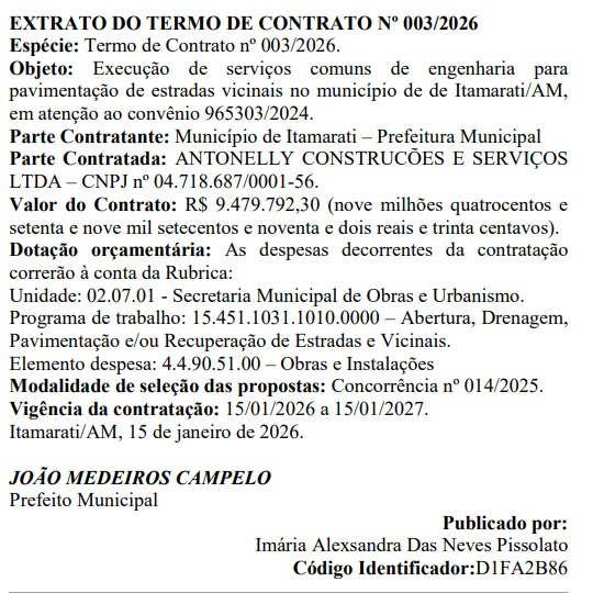 O documento publicado no Diário Oficial dos Municípios (DOM), foi assinado por Airton na última quarta-feira (21) e publicado nesta quinta-feira (29). Os contratos n° 030 e 031/2026 chegam ao valor global de R$ 7.770.399,12 para adequação de estradas vicinais e adequação da estrada do Taquara – trecho 1.