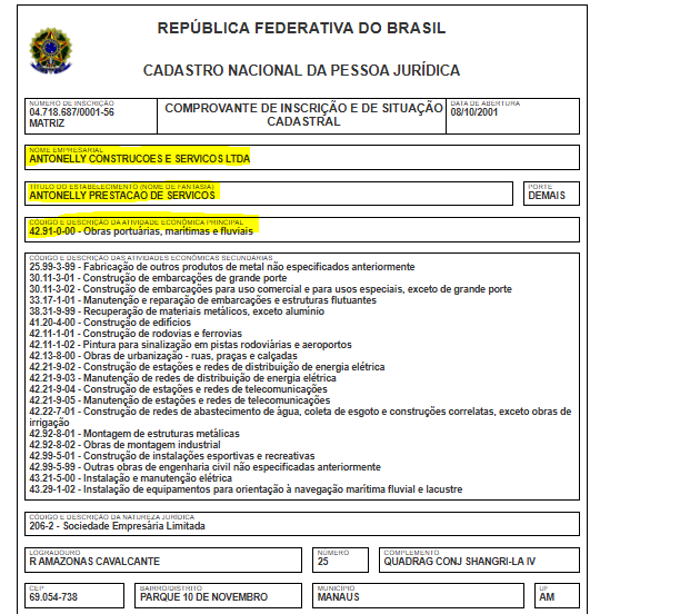 empresa com a razão social Antonelly Construções e Serviços Ltda, tem o nome fantasia Antonelly Prestação de Serviços, opera com o CNPJ 04.718.687/0001-56 e foi fundada em 08/10/2001. O endereço de sua sede está localizada na Rua Amazonas Cavalcante, 25 – Parque 10, Manaus. Sua atividade principal é de Obras portuárias, marítimas e fluviais.
