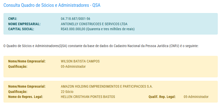 A capital social da empresa é de R$ 43 milhões e é representada pelo empresário identificado como Wilson Batista Campos, assim como uma empresa Amazon Holding Empreendimentos e Participações S.A, representada por Helen Cristhian Pontes Bastos.