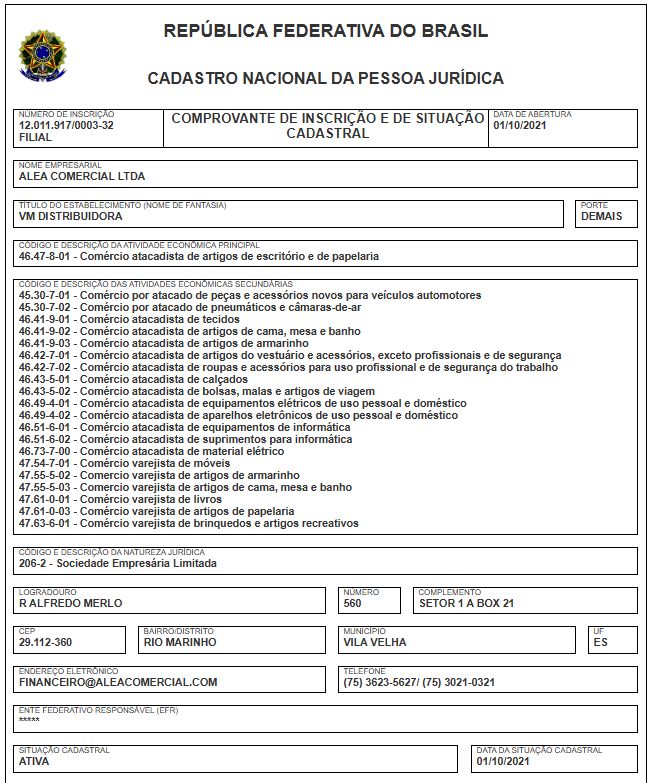 A fornecedora registrada no eventual contrato, é a empresa Alea Comercial Ltda, com um nome fantasia de “VM Distribuidora” inscrita no CNPJ nº 12.011.917/0003-32, localizada na cidade de Vila Velha, no estado do Espírito Santo.