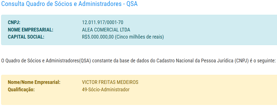 Conforme as informações da empresa Alea Comercial Ltda, a mesma tem como único dono, o empresário identificado como Victor Freitas Medeiros. Assim como também ele aparece como proprietário também da empresa matriz, na Bahia e outra empresa filial em São Paulo.