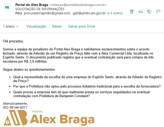 A equipe de jornalismo do Portal Alex Braga tentou contato com a Prefeitura e a Secretaria de Educação do município (SEMED), para pedir esclarecimentos sobre a adesão do Registro de Preço, feito com uma empresa do Espírito Santo, para fornecer materiais aos alunos da rede pública. Contudo, até o fechamento desta matéria não obtivemos retorno. O espaço segue aberto para mais esclarecimentos.