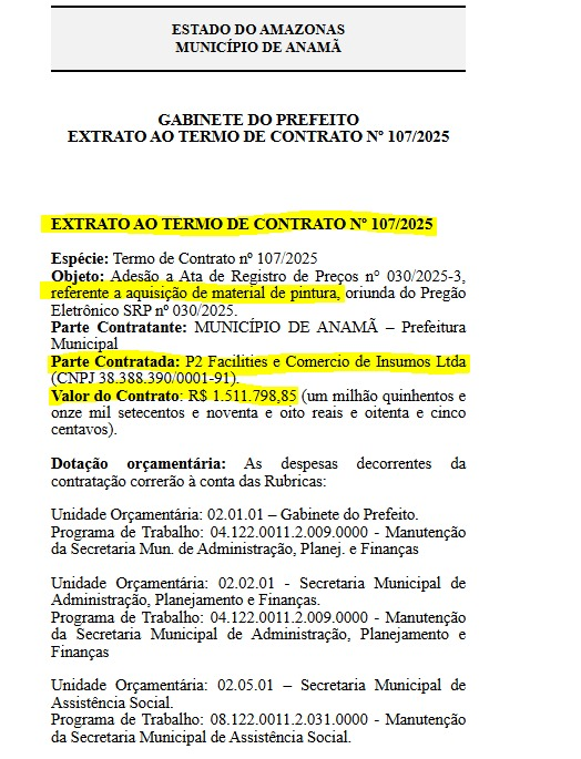 A prefeita de Anamã, Kátia Dantas (MDB), vai gastar o montante milionário de R$ 1.511.798,85 com material de pintura com a empresa P2 Facilities e Comércio de Insumos LTDA. O documento publicado no Diário Oficial dos Municípios (DOM), foi firmado em dezembro do ano passado e terá vigência de 1 ano e foi oriunda do Pregão Eletrônico n° 030/2025.