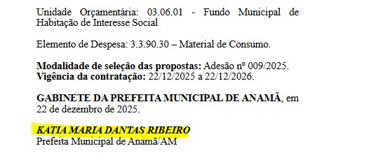 A prefeita Kátia Dantas (MDB), do município de Anamã (AM), homologou uma licitação que autoriza o gasto de R$ 1.508.760,47 para a compra de materiais e equipamentos de processamento de dados. O processo era referente ao Pregão Eletrônico nº 014/2025, que teve como objetivo o registro de preços para eventuais aquisições de itens de informática destinados às demandas da Prefeitura.