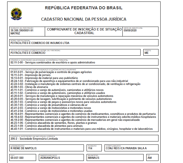 A empresa com a razão social P2 Facilities e Comercio de Insumos Ltda, tem o nome fantasia P2 Facilities e Comercio, opera com o CNPJ 38.388.390/0001-91 e foi fundada em 2020. O endereço de sua sede está localizada na Rua Rene de Napolis, 114 – Adrianópolis. Sua atividade principal é de Serviços combinados de escritório e apoio administrativo.