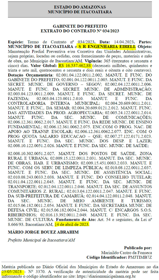 No referido contrato, o prefeito contratou a empresa, para prestar os serviços de “manutenção predial preventiva e/ou corretiva”. Assim como nas “unidades administrativas, sejam próprias, locadas ou cedidas, com fornecimento de peças, materiais e mão de obra”. Conforme descreve o extrato de contrato, publicado mais de um mês depois.