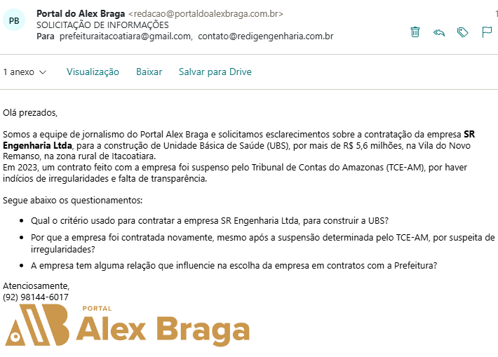A equipe de jornalismo do Portal Alex Braga tentou contato com a Prefeitura de Itacoatiara e com a empresa contratada. Afim de pedir mais esclarecimentos sobre a contratação milionária, suspensa pelo Tribunal de Contas do Amazonas e o novo contrato. Contudo, até o fechamento desta matéria, não obtivemos resposta. O espaço segue aberto para mais esclarecimentos.