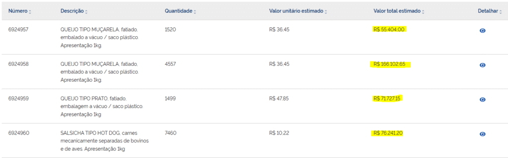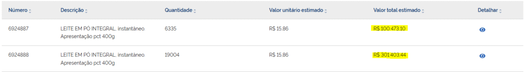 O terceiro item com a quantidade e valor expressivo é o leite em pó, que custará também quase meio milhão aos cofres públicos. E ainda diferentes tipos de pães por mais de R$ 1 milhão. Os valores ainda são expressivos, na compra de ovos de galinha, chegando a R$ 400 mil.