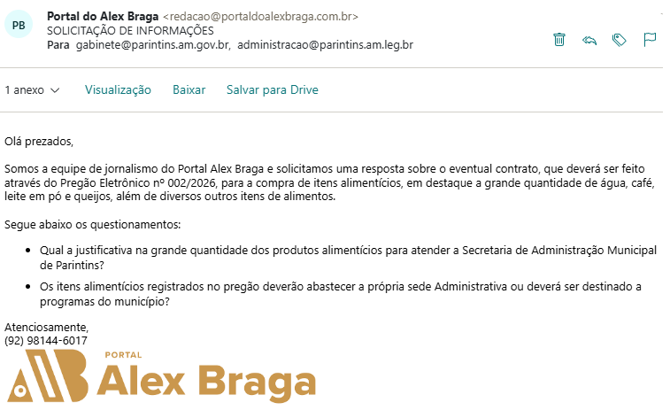 A equipe de jornalismo do Portal Alex Braga tentou contato com a Prefeitura de Parintins, para pedir mais esclarecimentos sobre as aquisições para a Secretaria de Administração do município. Contudo, até o fechamento desta matéria não obtivemos resposta. O espaço segue aberto para mais esclarecimentos.