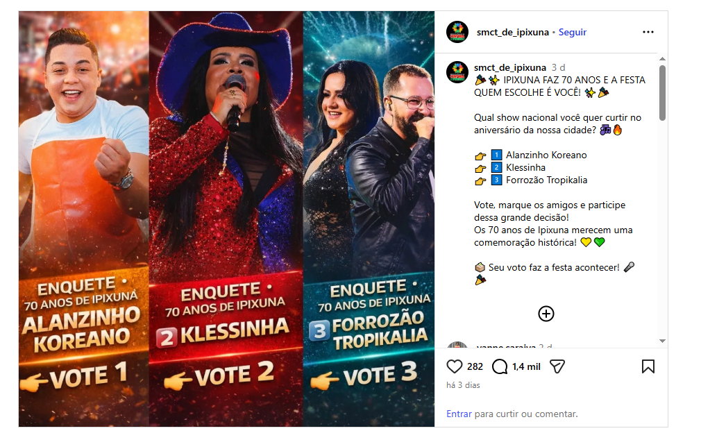 Enquanto o asfalto não chega, a Prefeitura movimenta as redes sociais para promover a festa de aniversário de Ipixuna. A enquete publicada convida a população a escolher entre artistas nacionais como Alanzinho Koreano, Klessinha e Forrozão Tropikália.