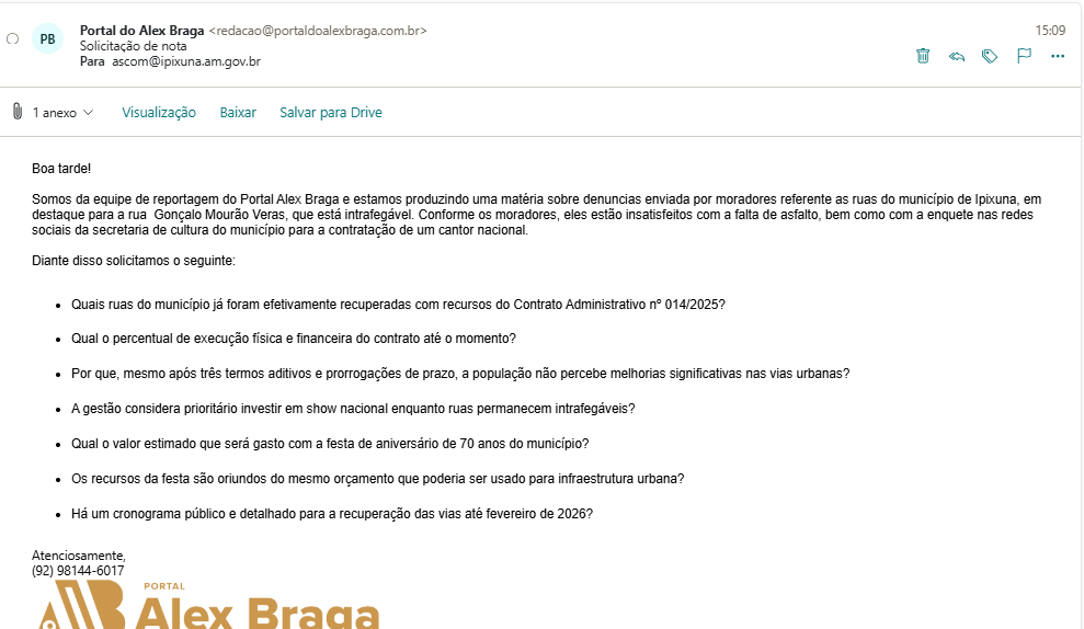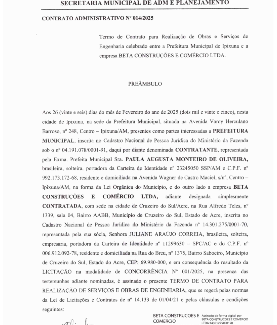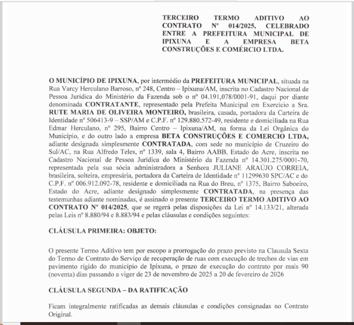 O abandono das vias urbanas chama ainda mais atenção porque, em 26 de fevereiro de 2025, a Prefeitura de Ipixuna firmou o Contrato Administrativo nº 014/2025 com a empresa Beta Construções e Comércio Ltda, no valor global de R$ 1.662.061,45.
