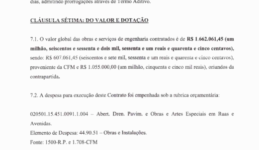 Do total, R$ 1.055.000,00 são recursos de contrapartida do próprio município, destinados especificamente aos serviços de “recuperação de ruas com execução de trechos de vias em pavimento rígido”.