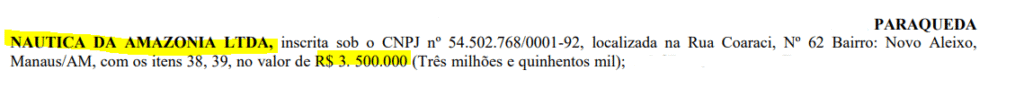 A empresa que receberá sozinha mais da metade do valor global do contrato, está localizada na capital amazonense, apresentando serviços náuticos, como reparação e manutenção de embarcações e ainda lavagem e polimento de veículos automotores.