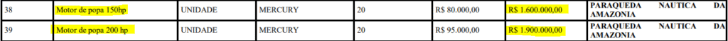 Mas uma empresa se destaca, ela receberá sozinha, o valor total de R$ 3,5 milhões, para fornecer motores de popa ao complexo administrativo da Prefeitura. A mesma está registrada como Paraqueda Náutica da Amazônia Ltda, inscrita no CNPJ nº 54.502.768/0001-92, ela vai receber mais da metade do valor global do Registro de Preços, assinado pelo prefeito.