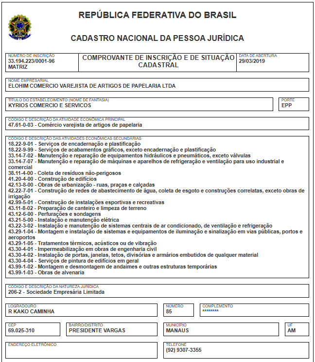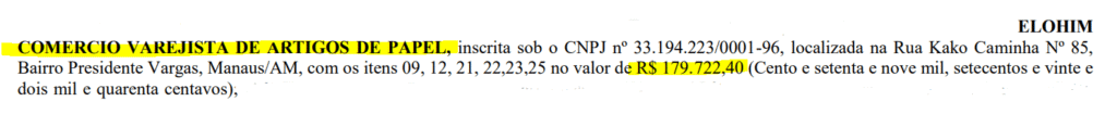 A segunda empresa, registrada como Elohim Comércio Varejista de Artigos de Papel Ltda, tem como atividade principal, os serviços de comércio varejista de artigos de papelaria. Assim como, os serviços de coleta de resíduos, construção de edifícios, manutenção elétrica, de ar condicionado, de ventilação e refrigeração e tantas outras atividades.