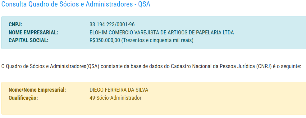 Com um capital social de R$ 350 mil, a empresa tem como administrador o empresário identificado como Diego Ferreira da Silva, conforme as informações da empresa no quadro de sócios e administradores.
