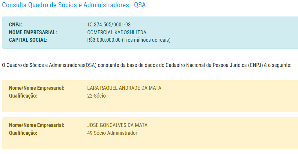A terceira empresa registrada como Comercial Kadoshi Ltda, que apresenta como atividade principal o comércio varejista de alimentos, mas também afirma apresentar os serviços de confecção de roupas, construção de edifícios, rodovias, instalações e entre outras atividades.