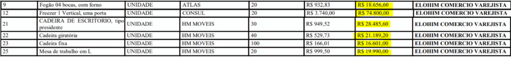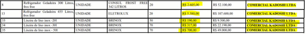 Mesmo tem com a sua atividade predominante a venda de alimentos, ela vai fornecer à Prefeitura, eletrodomésticos e lixeiras de inox por um total de R$ 240.390,00 (Duzentos e quarenta mil, trezentos e noventa reais).